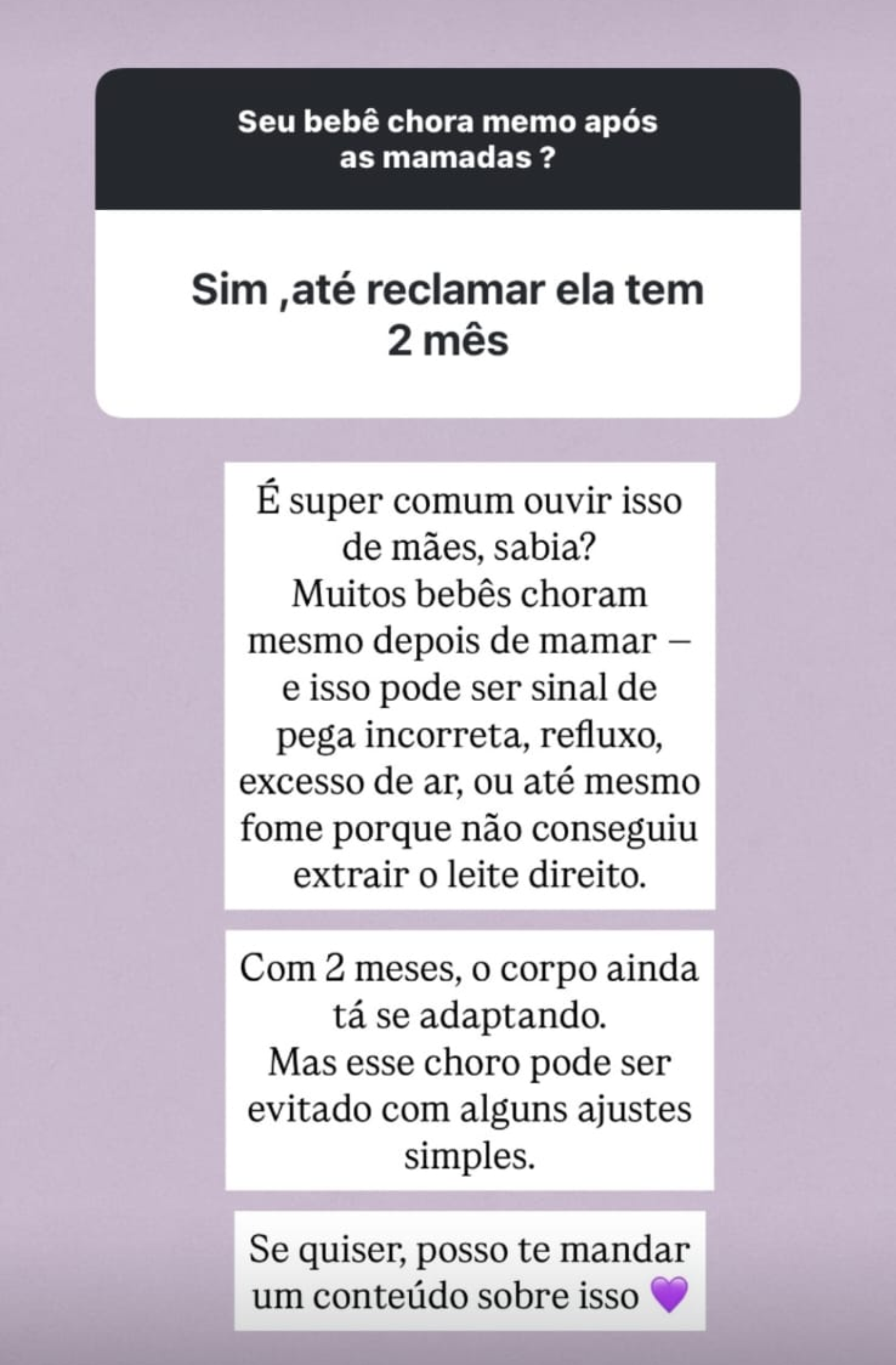 “Meu bebê chora mesmo após as mamadas. Sim, até reclamar. Ele tem 2 meses.”